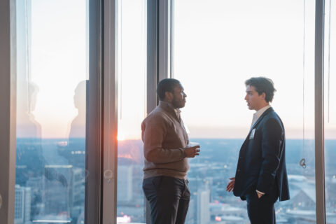 Attendees Ade Sanusi, Jr. and Hunter Goldberg enjoy the vibes and views from Bank of America Plaza’s top floor at the cocktail reception following the event.