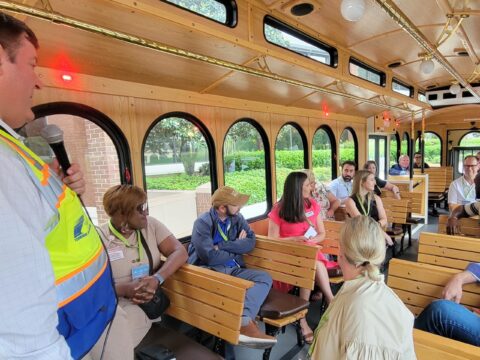 Forum attendees take part in a trolley tour of the Port of Savannah’s Garden Terminal the day before the Forum